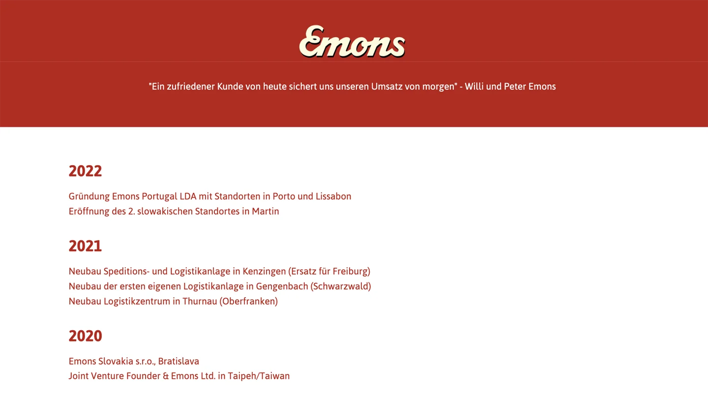 Emons hatte bereits gute Ansätze zur Darstellung ihres Leistungsportfolios. Das Problem: Content. Das bestehende System erlaubte zwar neue Seiten, bot aber kaum gestalterische Möglichkeiten. Inhalte waren schwer lesbar und unübersichtlich.