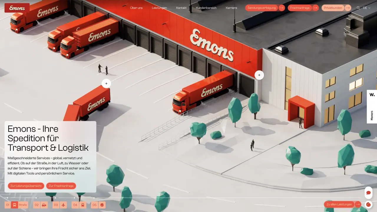 Allerdings gibt es viele verschiedene Methoden, um 3D-Animationen auf einer Website zu integrieren. Für Emons haben wir die 3D-Animationen als Videos ausgegeben und die entsprechenden Sequenzen und Loops in die Website eingebunden. Auf diese Weise müssen Besucher:innen keine zusätzliche Rechenleistung aufbringen, sondern lediglich das Video laden. Der Rest passiert ganz von allein.